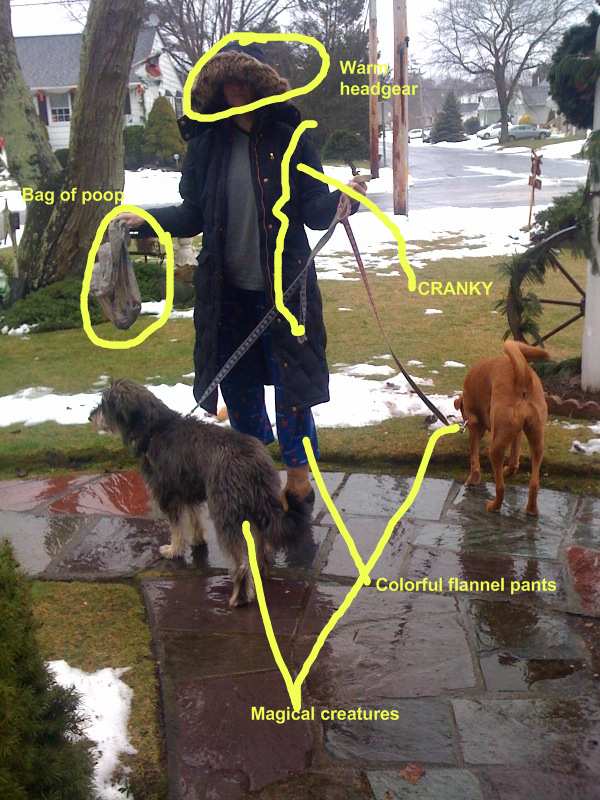 We have created a character based on my morning suburban dog walking garb. Dubbed the Magical Christmas Elf, she muddles through in her LLBean boots, colorful flannel pants, and massive headgear. Exhausted and cranky, she is always accompanied by her merry band of magical four legged creatures and wanders the streets of Long Island with a giant bag of poo. So you best be on your best behavior or you just might end of with a sack of shit on your doorstep next Christmas, courtesy of this mystical figure.
