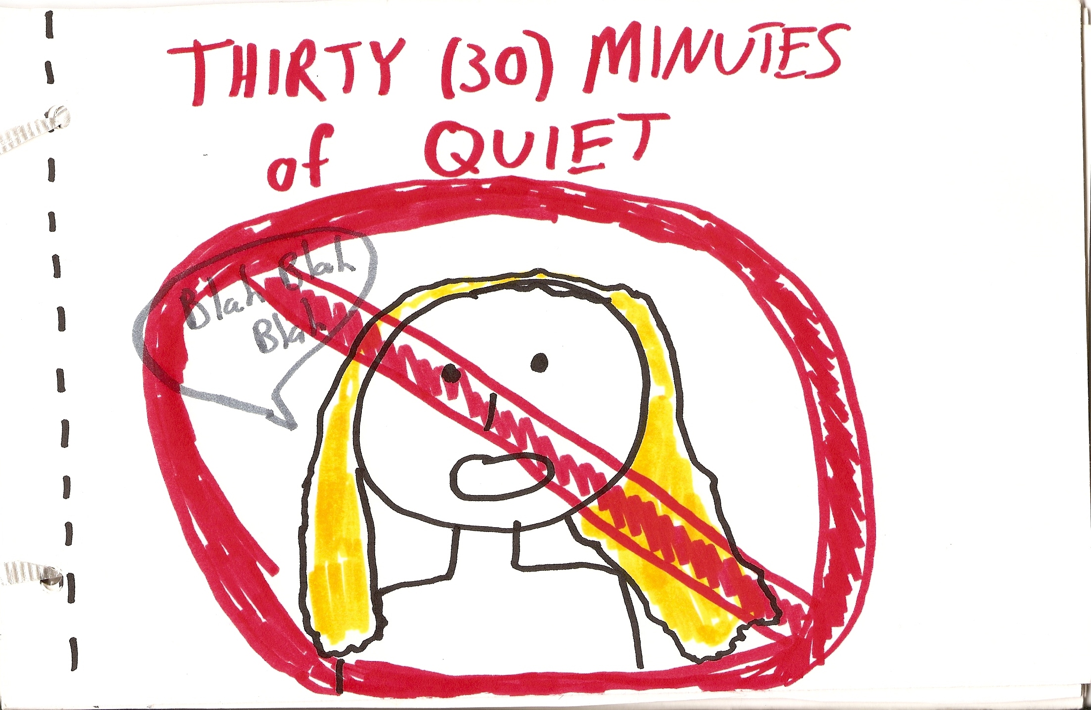 Thirty (30) Minutes of Quiet. When I first received this coupon, I immediately had the foresight to ask that I could redeem this in 5 minute increments. I still have 25 minutes left!**